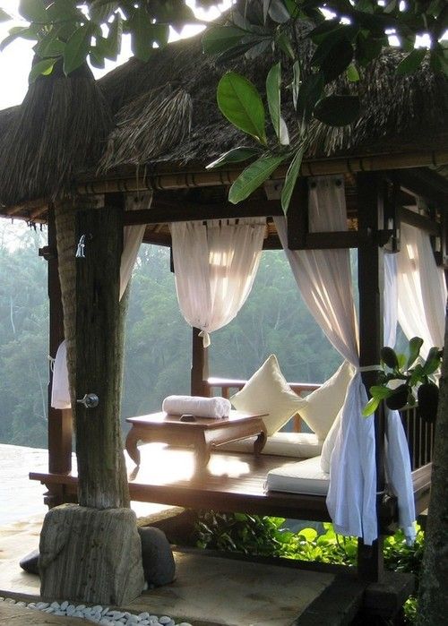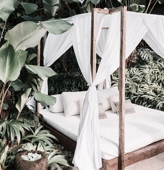 Si te gustan los ambientes orientales, que siempre están de moda puedes colocar alguna estructura en forma de cama en el jardín o en la terraza y vestida con telas frescas, llamativas y alegres convertirás este espacio en el rincón favorito de la casa.