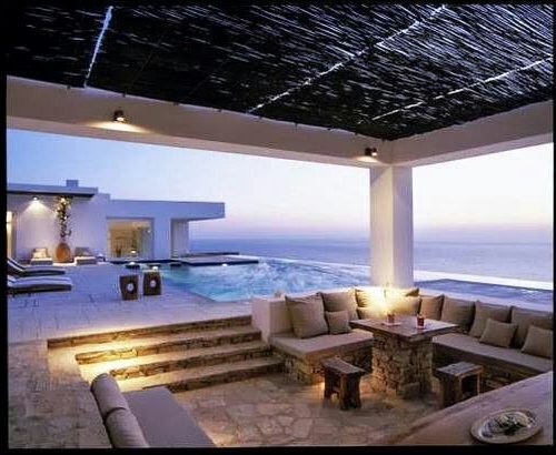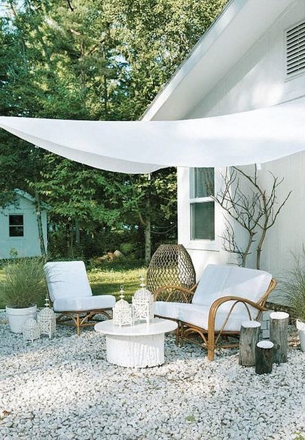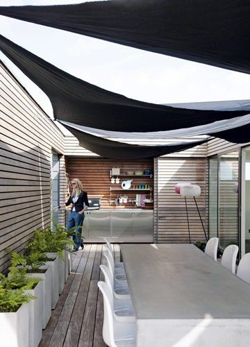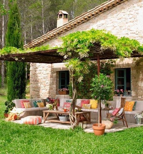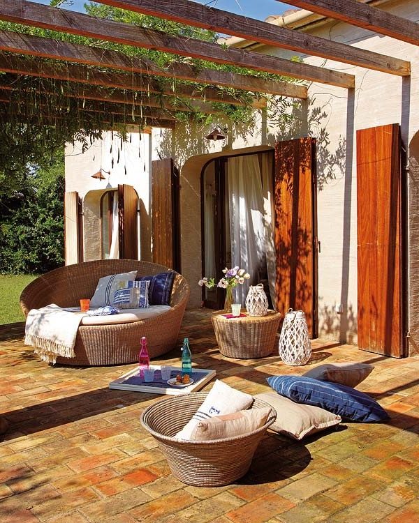 Si la casa tiene forma de U puede situarse en el espacio central un techo apergolado formado por lonas en forma de vela o de una estructura de hierro donde se enrolla una planta trepadora para crear una nutrida sombra.