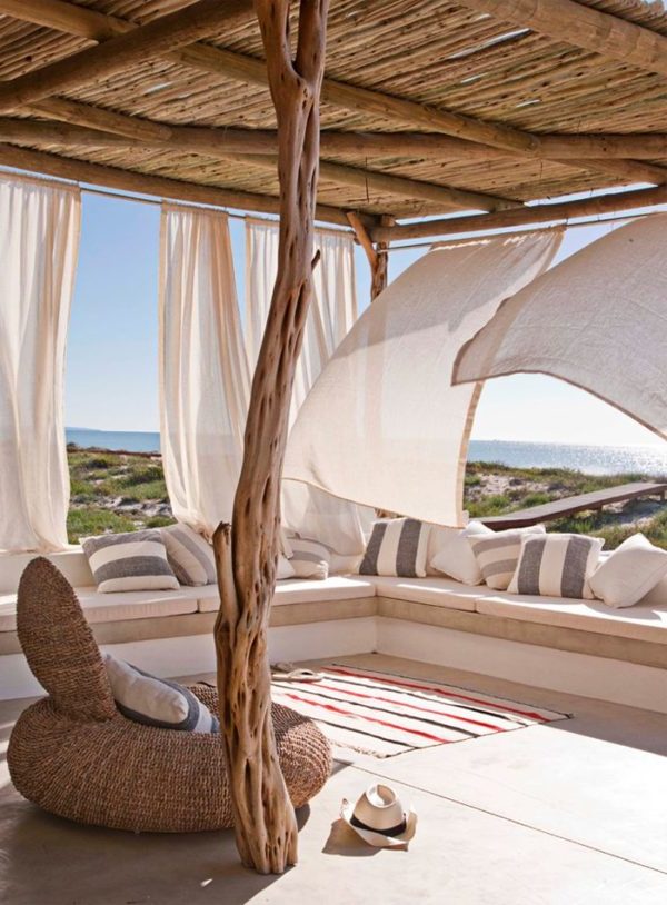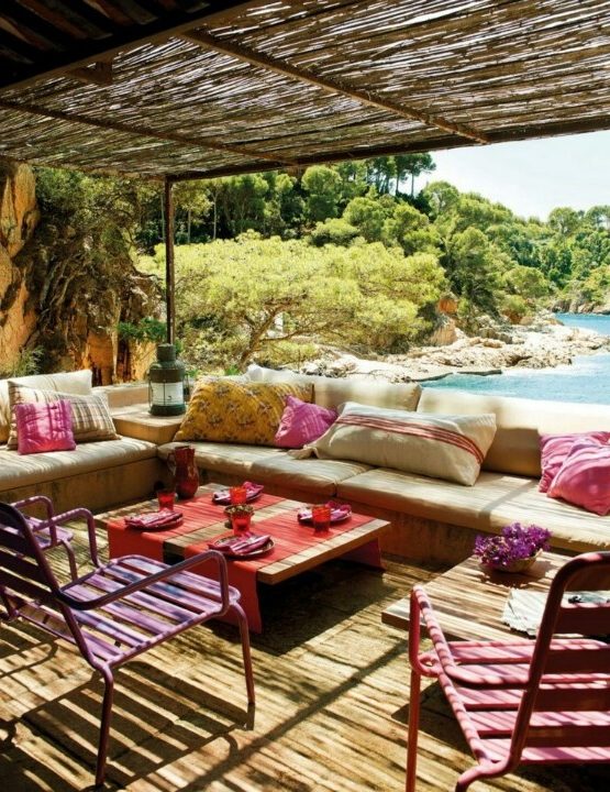 Techos de caña o mimbre: otra opción es colocar techos de caña o mimbre encima de la pérgola para protegerse del sol, además proporcionan un aspecto rústico y natural al espacio exterior.