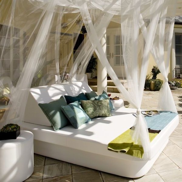 Si sitúas la pérgola en algún punto del jardín de forma exenta sin apoyar a paredes, creas un cenador, que con telas vaporosas y cubiertas de lona te aportaran un espacio íntimo y de relax para leer o dormir la siesta.