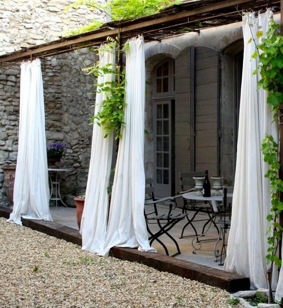 Las pérgolas quedan muy decorativas colgándoles cortinas fluidas, que además proporcionan sombra cuando sol incide por los laterales.
